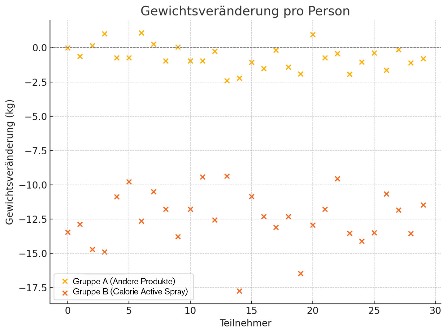 Jeder Teilnehmer der Testgruppe B ( Calorie Active Spray) konnte erfolgreich Gewicht verlieren.